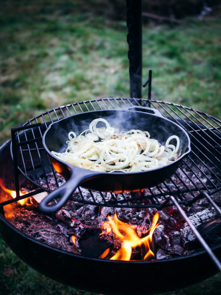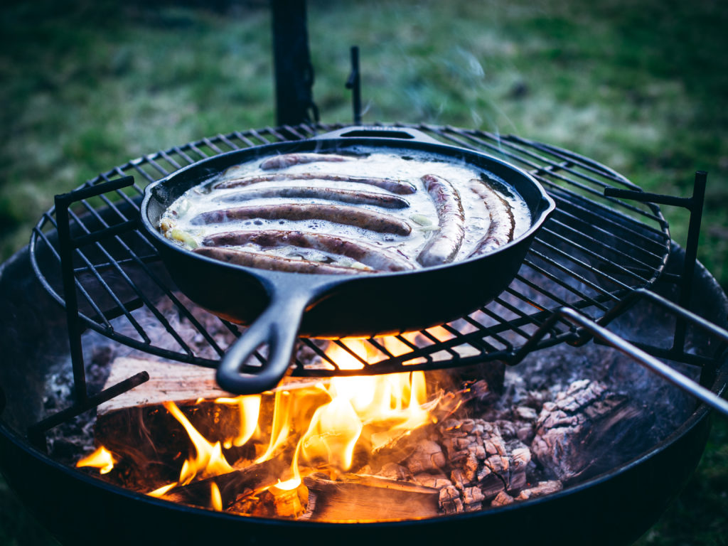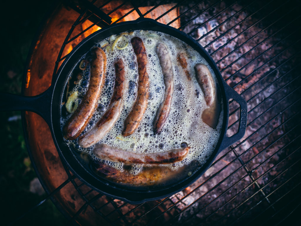 This is the season we find ourselves cooking outdoors as much as possible, grasping onto the end of autumn. A good sausage (pølser), whether cooked outdoors over an open fire or on the stovetop, is always welcome. To get the most flavor while ensuring the sausages don’t dry out, braising sausages in beer (øl) is a match made in heaven.