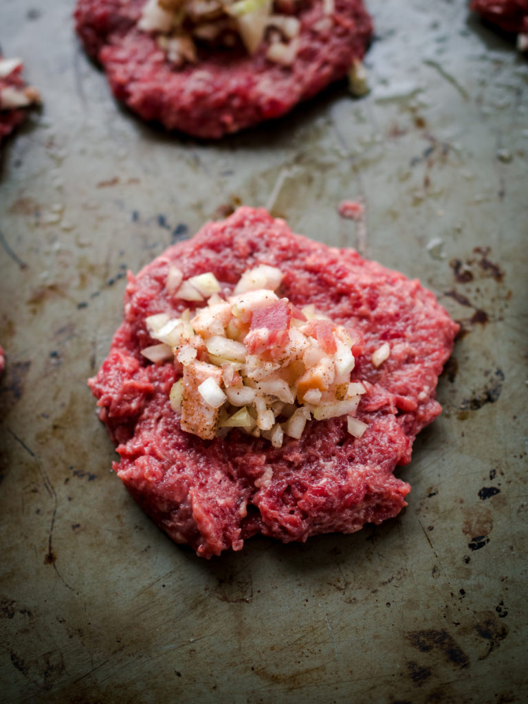 While both variations are made today, it seems more common to find benløse fugler made with ground beef. The cooking time is also shortened from 2 hours to 20 minutes. For this recipe, I lean into this version with a filling of finely chopped onions, bacon, and the traditional warm spices found in the early recipes as well.