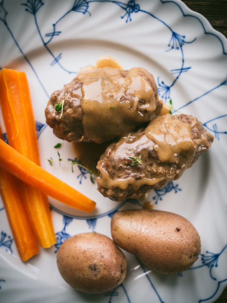 Benløse fugler, which translates as “boneless birds”, is an old-fashioned comfort dish also referred to as fattigmannsfugler “poor man’s birds”. The name is connected to the shape and look of the oval rolls. There are two variations, one made with ground beef and the other with thin strips of beef, such as round and sirloin.