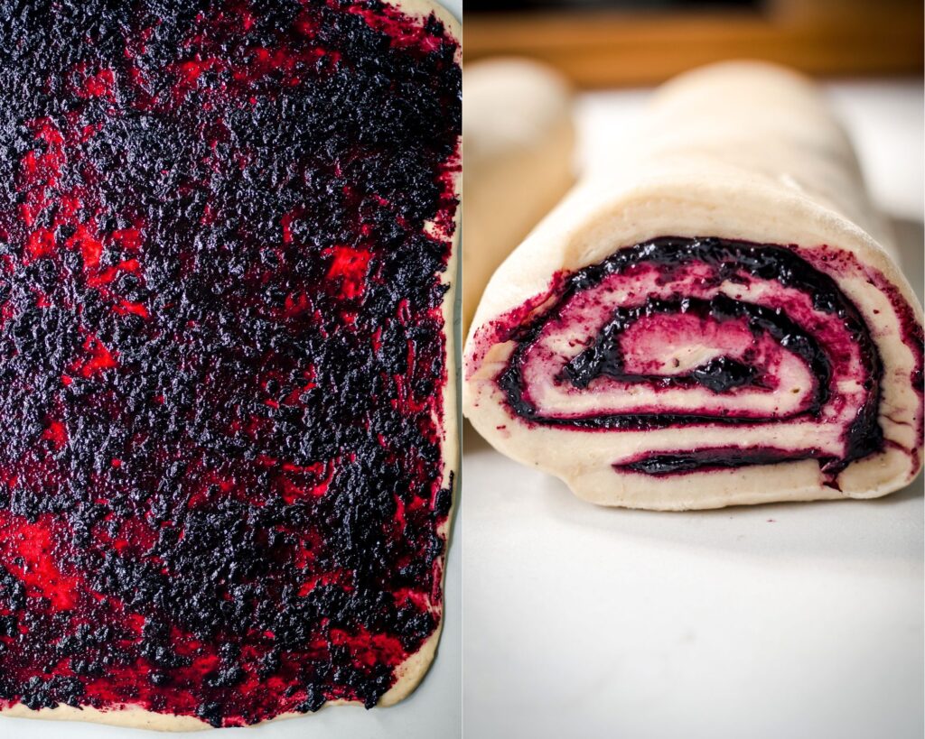 On a lightly floured surface, using a rolling pin and more flour as needed to prevent sticking, roll out the dough into a large rectangle that measures roughly 20 x 15 inches (50 x 38 cm). Spread the filling evenly across the dough all the way to the edges. Starting on one of the long sides, roll the dough around the filling to form a long, roughly 20 inch (50 cm), log. Using a sharp knife, cut the log crosswise into 12 equal size buns. Place the buns on the prepared baking sheet, cover with a tea towel, and let rise in a warm spot for 40 minutes.