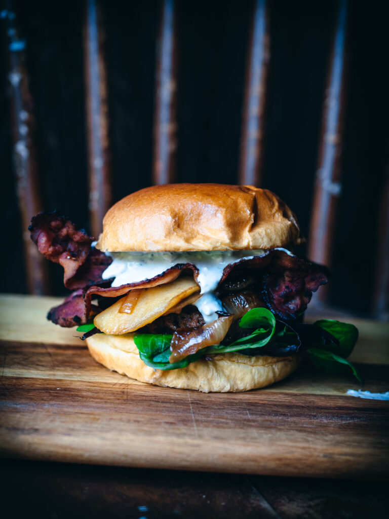 Enjoying these in the garden surrounded by apple trees is a wonderful way of appreciating the season and the bounty that it provides. You can also swap out the blue cheese sauce and just melt a flavorful cheese, such as brie, over the patties as they finish cooking. You can also omit the bacon altogether and still have a decadent burger.