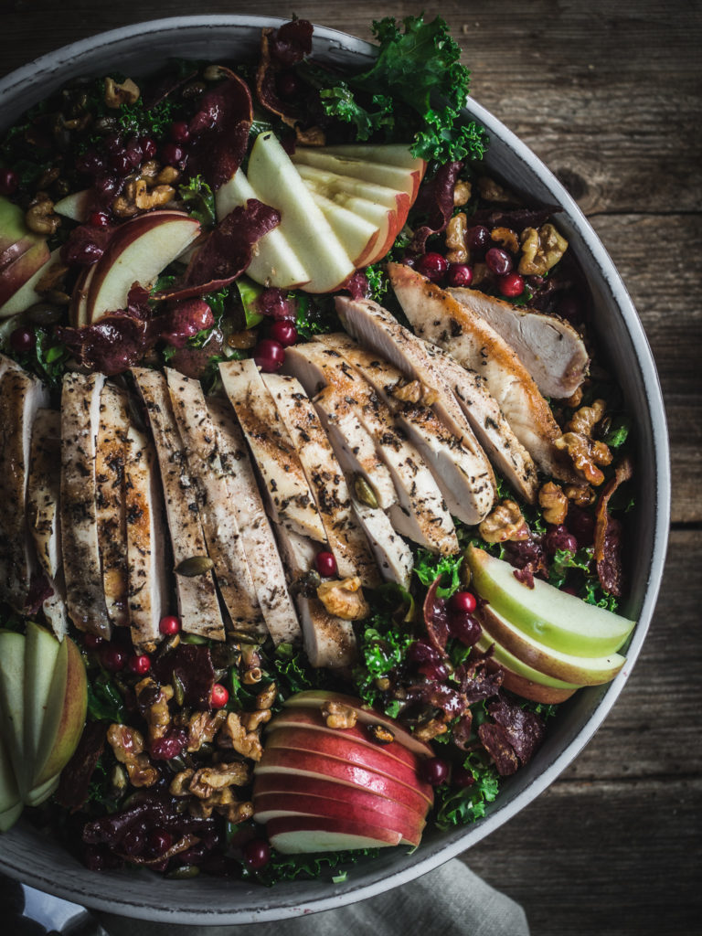 This harvest salad features Norwegian chicken with warm herbs and spices, tart apples from the garden, sweet and salty walnuts and pumpkin seeds, crispy fenalår (cured lamb leg), and hearty kale and brussels sprouts all blanketed in a tangy lingonberry dressing.