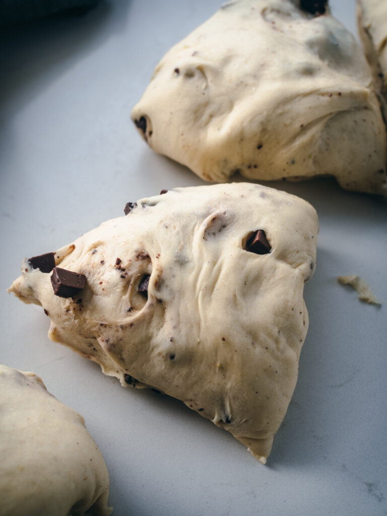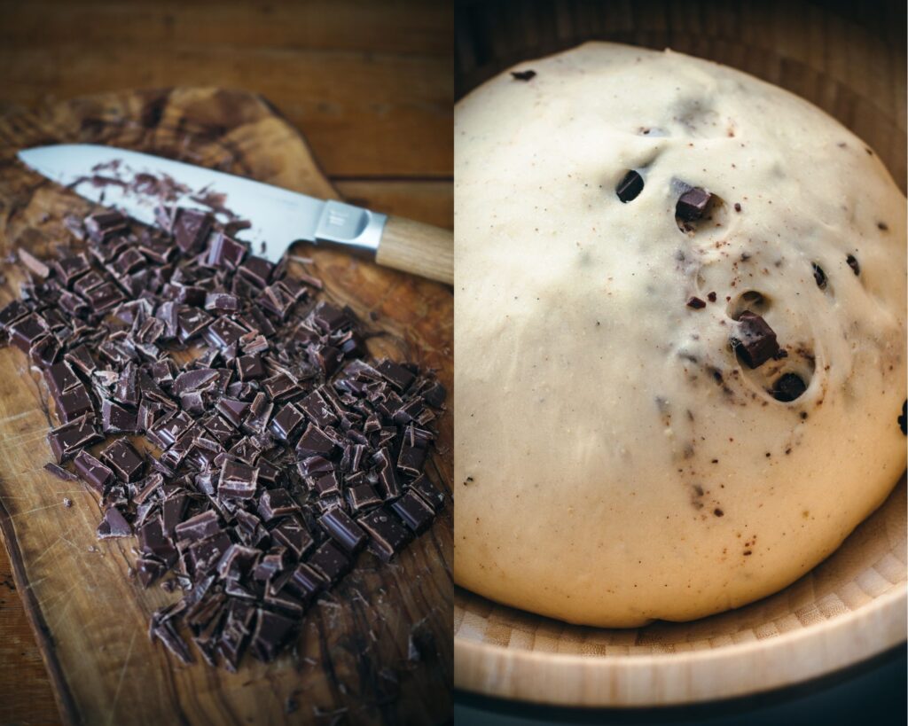 In a stand mixer fitted with the dough hook attachment, combine the flour, sugar, yeast, cardamom, and salt. Add the milk mixture and knead on low for 8 minutes. Add the butter and knead on medium for about 5 minutes or until the dough is very elastic and somewhat moist. Add the chocolate pieces and knead them into the dough, either in the stand mixer or by hand. Transfer the dough to lightly buttered bowl, cover with a tea towel, and let rise in a warm spot for 1 hour or until doubled in size.