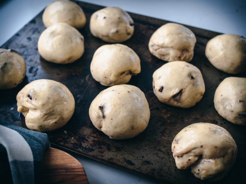 Divide the dough into 12 equal-size pieces and shape into balls. Place the balls of dough on the prepared baking sheet and let rise for 30 minutes.
