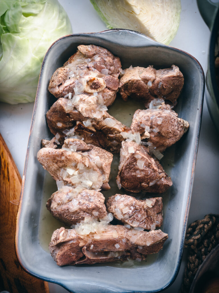 When serving, a very traditional onion sauce that is both sweet and sour is paired with the meat along with boiled potatoes. This truly is a wonderful meal to serve at this time of year when it’s getting colder and the harvest produce is plentiful.