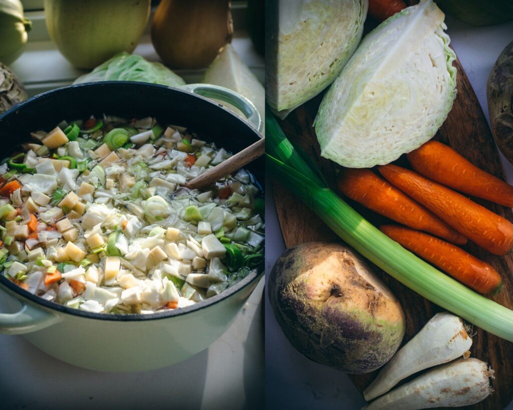 Filter the stock with a mesh strainer and discard the bay leaf. Bring to a boil then add the carrots, parsnips, rutabaga, leek, and cabbage and cook for about 15 minutes or until tender. Measure about 2 cups (480 ml) stock and set aside for the onion sauce.
