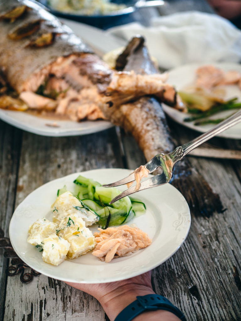 There are various ways to grill a whole salmon and I have included some suggestions in the recipe below. Typical sides for salmon in Norway include grilled vegetables, cucumber salad and potato salad, although you can serve whatever local and seasonal sides you prefer.