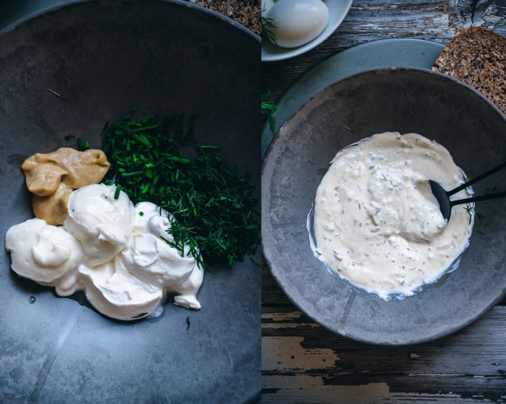 In a medium bowl, combine the mayonnaise, sour cream, mustard, dill, chives, and lemon juice. Add the eggs and stir to combine. Season to taste with salt and pepper. Garnish with fresh herbs.