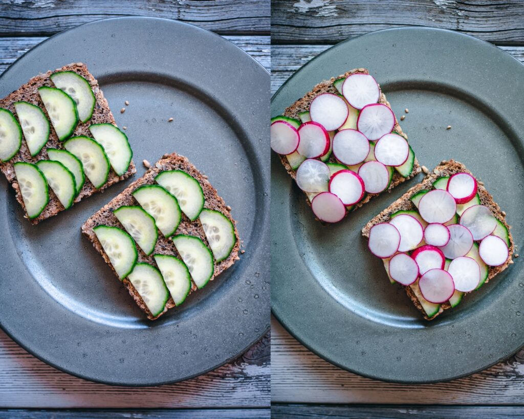 It’s such an easy and simple salad to whip up. I like to add in fresh herbs and a squeeze of lemon to brighten it up. You can serve it simply alongside bread and crackers or some garden greens. You can also make a delightful open-faced sandwich with cucumbers and radishes as I have here, or with some slices of smoked salmon.