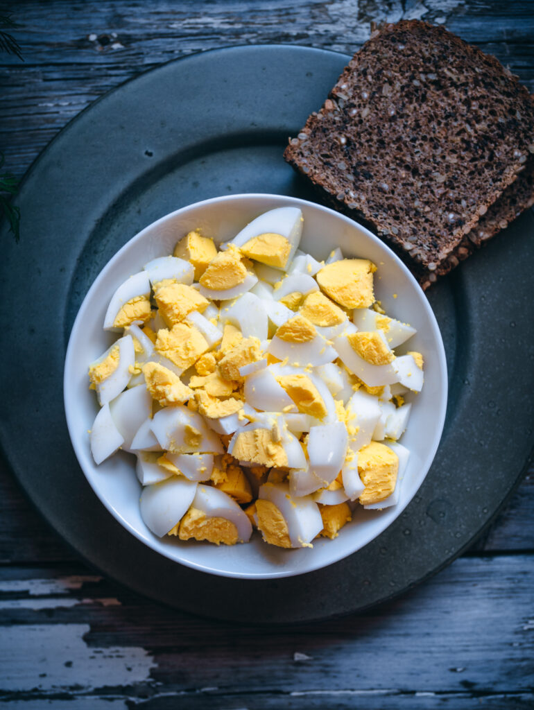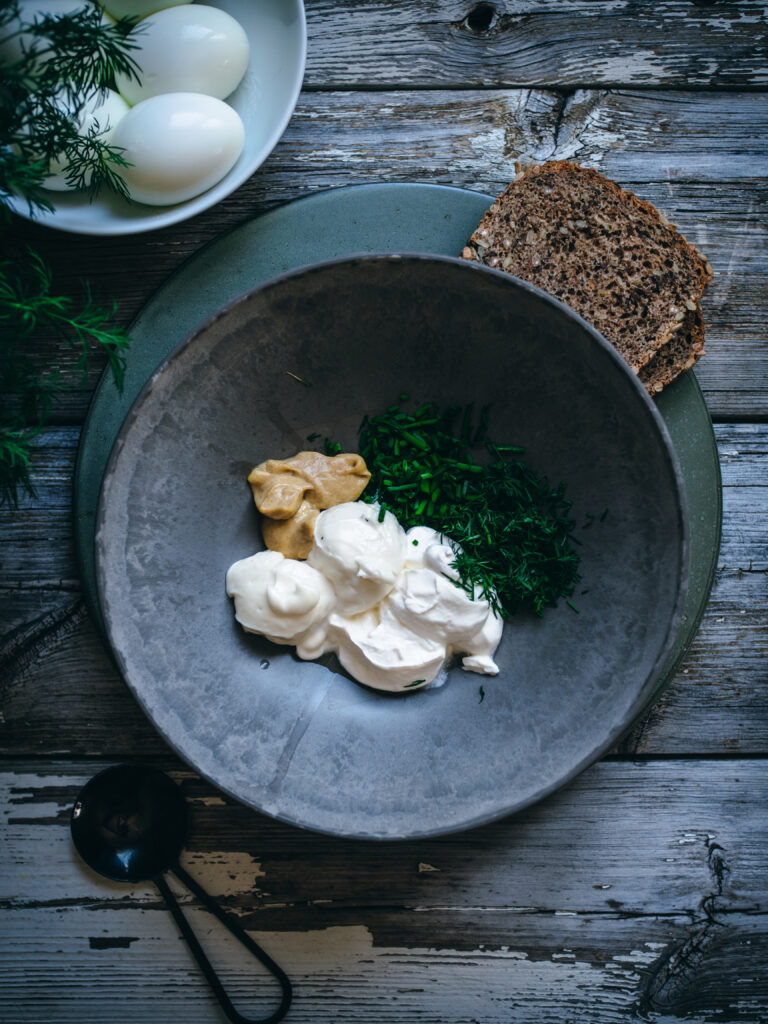 The cold buffet “koldtbordet” isn’t complete without an egg dish, and the classic egg salad is a perfect offering. As we celebrate Norway’s Constitution Day on the 17th, the breakfast table will be filled with a gorgeous array of breads, cured meats, smoked salmon, lefse rolls, shrimps, condiments, and homemade salads like this herb egg salad.