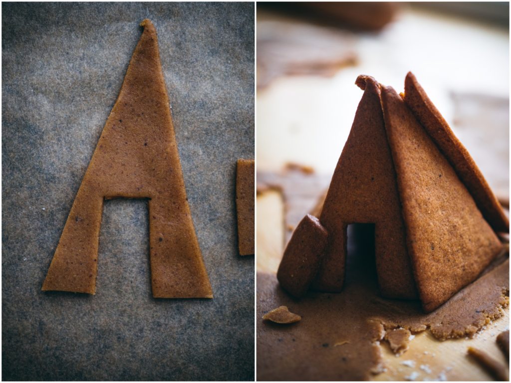 *For the lavvo: I made an 8 x 5 cm triangle cutout from cardboard. You’ll need it to make five shapes from the dough, with one of them being the entry way (cut out a little door to put next to the lavvo on the cake). I also made a circular pepperkake wide enough for the lavvo to sit on. When ready to assemble, take the baked pepperkaker shapes and use the leftover Brunost caramel sauce to stick the sides together as you create a lavvo around the base.
