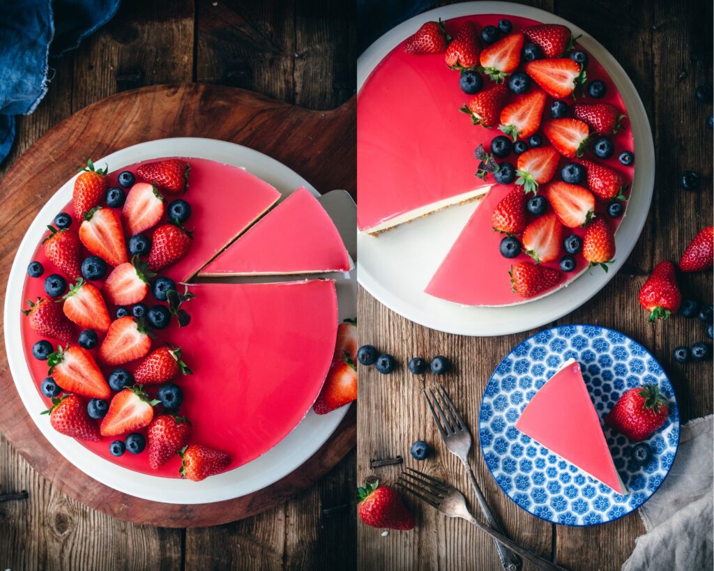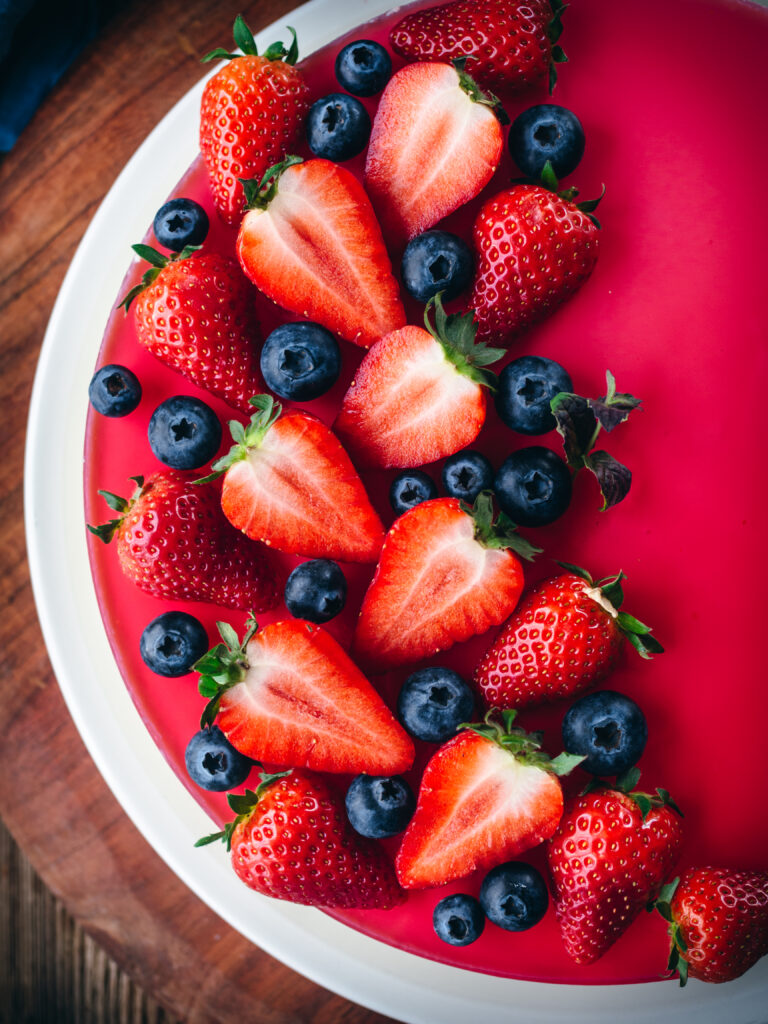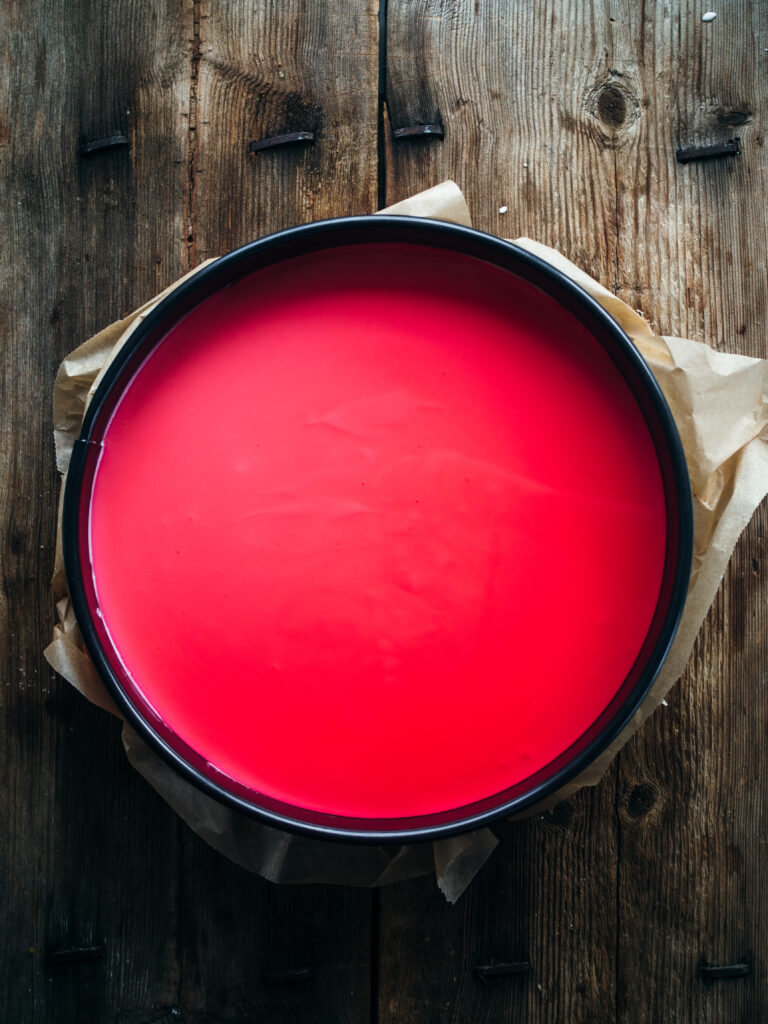 I like to use my standard cheesecake recipe and then top it with raspberry jelly, though you could use any other flavor you so desire. A decoration of fresh berries on top truly elevates the cake in the most eye-catching way. Edible flowers and fresh mint would be most welcome as well.