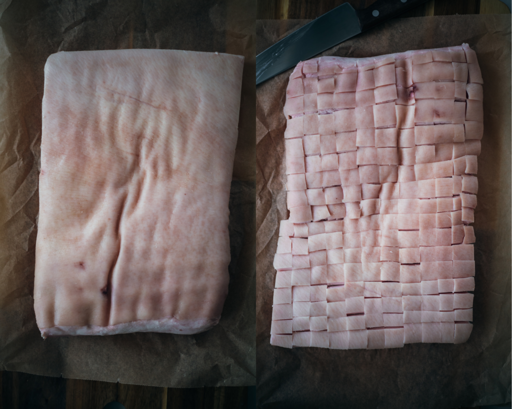 Using a sharp knife or utility knife, slice the pork belly through the fat and slightly into the flesh in a square pattern, with the squares being about ½ inch (1 ½ cm) in size.