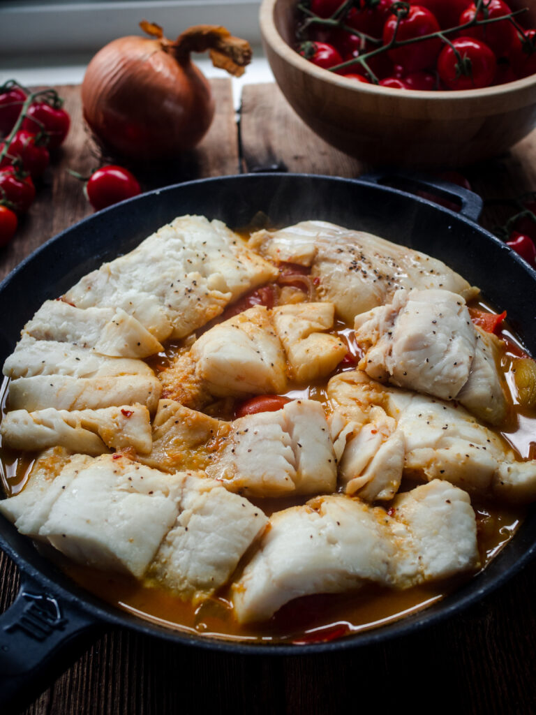 The inspiration behind this buttery cod with tomatoes and peppers is Norwegian bacalao, a dried and salted cod stew that is one of the lasting impacts from the spansketiden “the Spanish time” when Spanish ships began collecting salted and dried cod directly from Kristiansund in the 1830s. Instead of dried and salted cod, I use fresh cod in this dish, which makes it much simpler and quicker to make. The cod filets steam on top of the tomato and red pepper mixture. Before it’s served, some butter is stirred into the sauce making it extra velvety and toothsome. It’s an ideal dinner to make during the week or even for a special occasion.