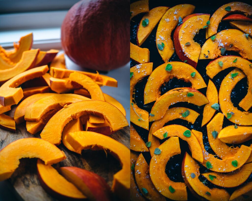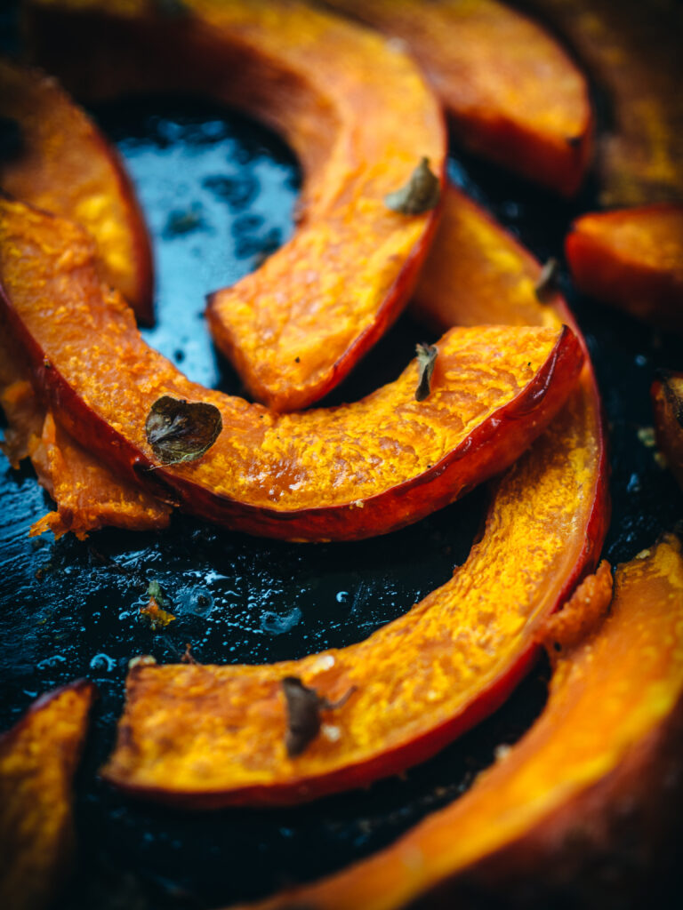 Cut the Hokkaido pumpkin into thin wedges and remove the seeds (feel free to save the seeds to roast for later). Add the pumpkin wedges to the prepared baking sheet, drizzle with the olive oil, add the oregano leaves, and toss with your hands to evenly coat the pumpkin. Season with salt. Bake for 40 minutes or until nicely browned and softened, but still keeping its shape. Set aside to cool.