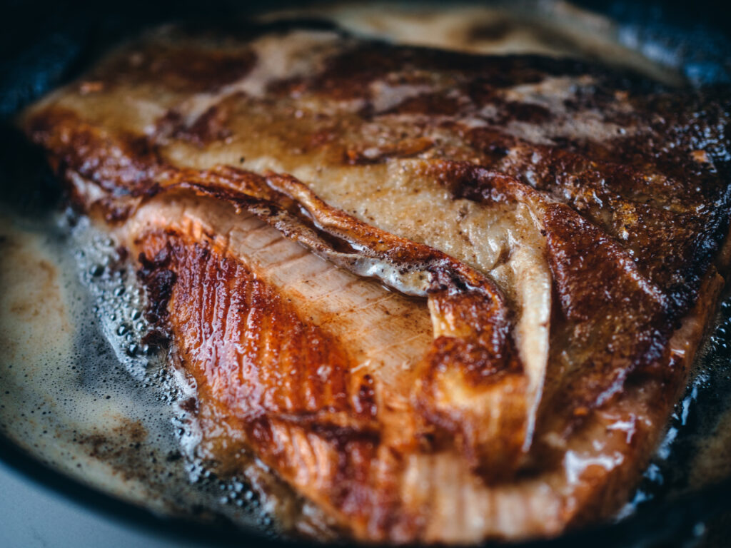 In a large, non-stick frying pan, melt the butter over medium-high heat. Add the trout, skin-side down, and cook undisturbed for 6 minutes. Carefully turn the trout over for about 2 minutes, or until the flesh is just cooked through and starting to flake. Transfer the trout, skin-side up, onto a large serving platter.