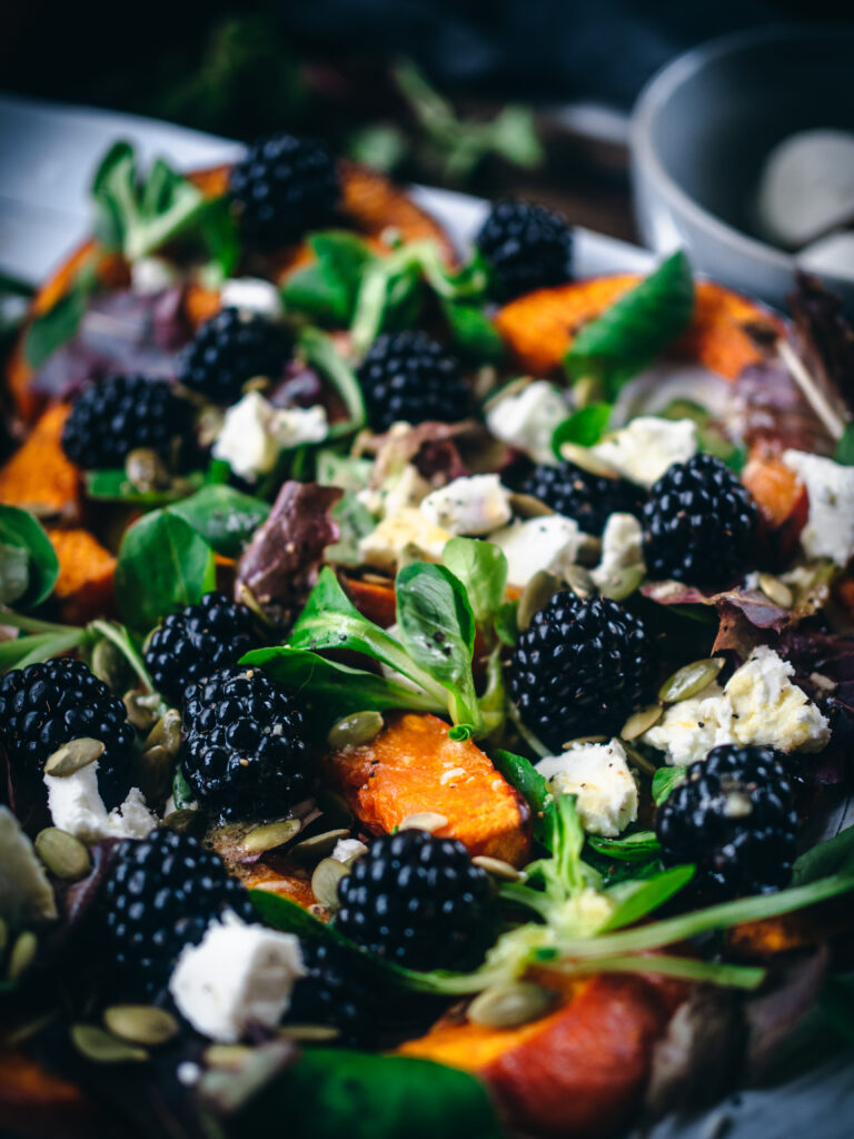The blackberries provide a delicate earthy freshness, while the soft goat cheese is salty and tangy. The pumpkin seeds, which could be roasted as well or flavored with some spice, add a lovely texture. To round off all the flavors, a very simple vinaigrette with garlic and Dijon blends nicely into the others, allowing each ingredient to shine.