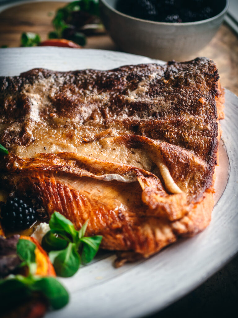 Serve the trout and the pumpkin salad next to each other or by flaking the trout and placing on top of the salad. Choose delicate salad greens of your preference, and use blueberries or seedless grapes in place of the blackberries if desired. If using individual trout filets rather than a side piece as I have done here, adjust the cooking time to slightly less.