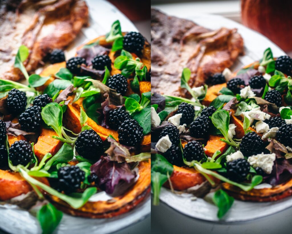 Pan-Seared Steelhead Trout with Roasted Pumpkin, Blackberries & Goat Cheese