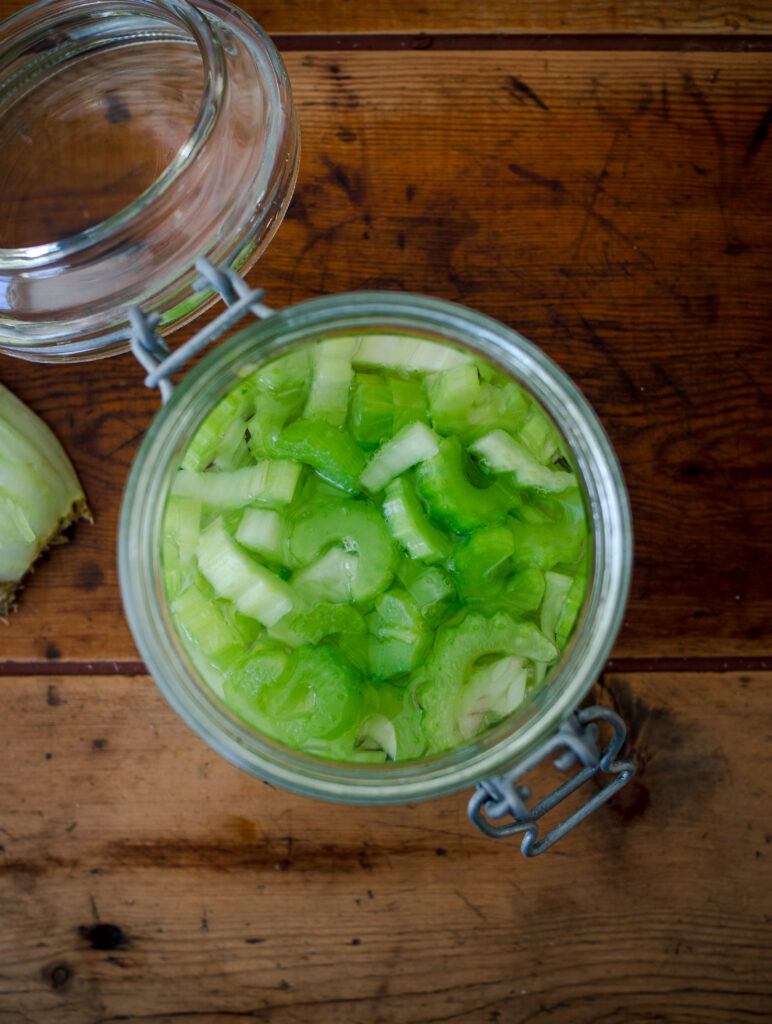 For the pickled celery, in a small saucepan, bring the water, vinegar, and sugar to a simmer over medium heat and cook until the sugar has dissolved. In a glass jar, add the celery slices and pour the brine on top. Let sit at room temperature for about 1 hour or until cooled.