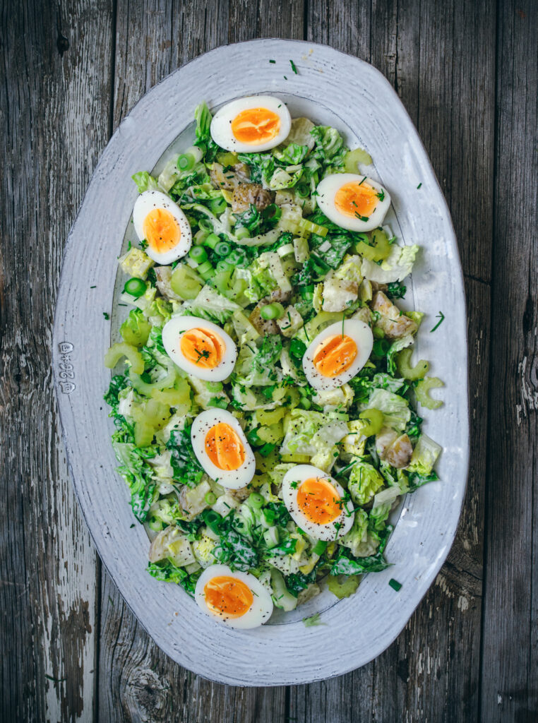 This delightful spring salad is simple and refreshing. The crispness of the lettuce paired with potatoes and tangy, crunchy, quick-pickled celery makes this salad stand out among other typical potato salads. It’s dressed with a simple sour cream and mayo dressing and the addition of soft-boiled eggs really rounds this out as a complete dish. It provides a unique salad for the table and would be wonderful served alongside a grilled main or even as a stand-alone lunch. A topping of croutons or toasted seeds would be welcome as well.