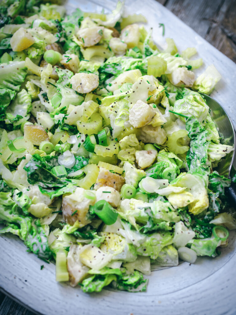 Spring has officially arrived, despite the snow-covered landscape and winter’s unrelenting grasp. That’s to be expected here in the north, as we’re nestled into the mountainous valley. As each day passes, the signs of spring become more vibrant and this is certainly reflected in the kitchen. Casseroles and slow-cooked meals make way for lighter dishes, and this potato and lettuce salad with pickled celery is just the dish to put a little spring back into our step.