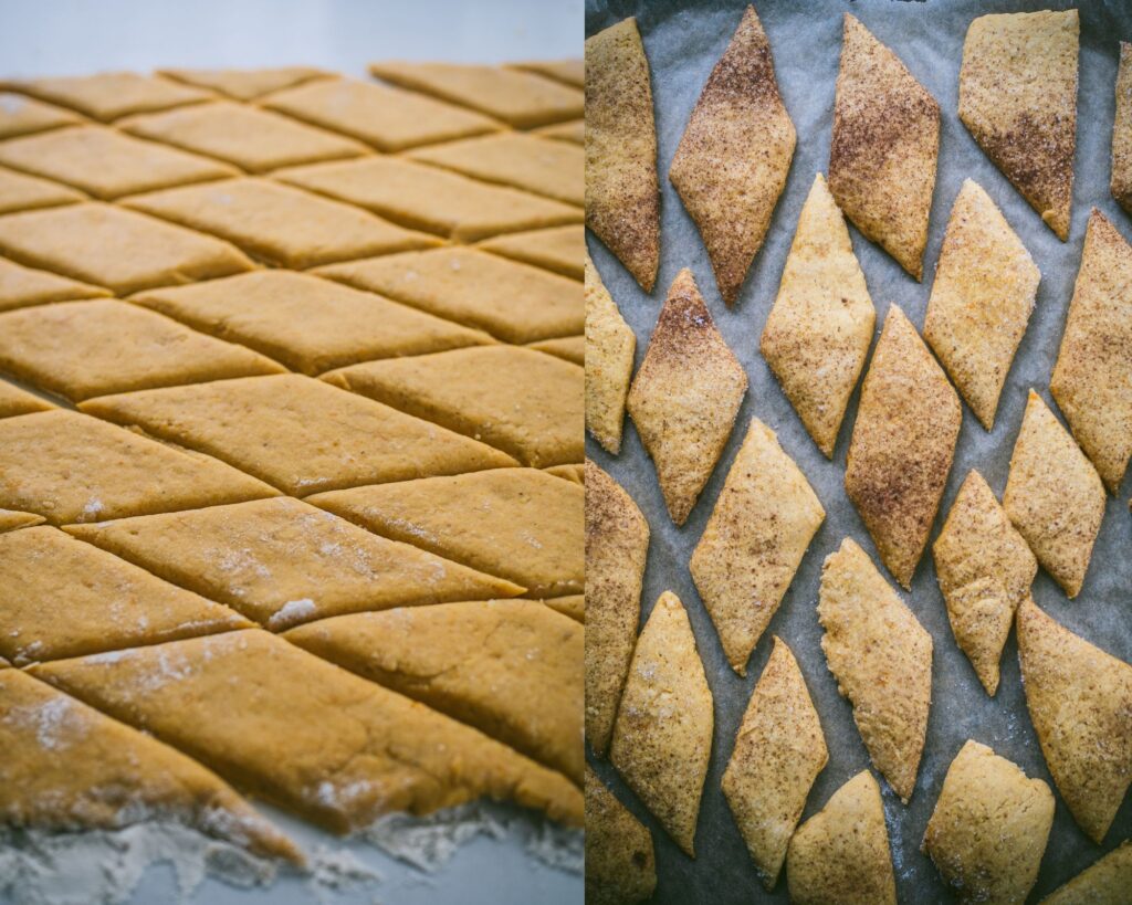 You’ll find the classic recipe for snipp from Numedal here. I also feature a variation of them with fireweed/rosebay willowherb (geitrams) petals in my latest Norwegian Baking cookbook. Every autumn, though, I always make a batch with homemade pumpkin puree and warm spices to highlight the season. These pumpkin collar cookies never last long as they’re gobbled up quickly, so I end up baking these quite a few times over the months of October and November.