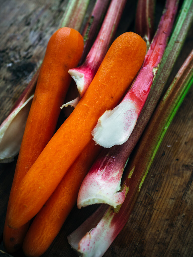 With spring comes rhubarb! A season that takes a little longer to reach us in the north, but when it does, we make the most out of it. While there are many ways to cook with rhubarb (after the compulsory raw stick dipped in sugar), I really wanted to combine it with one of my favorite cakes, carrot cake. One that’s not fussy, but simply captures all the flavorful essence.