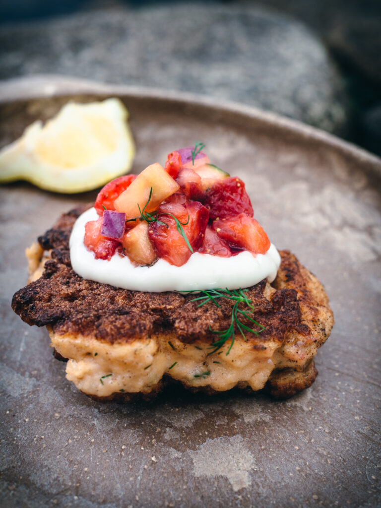 Salmon Fish Cakes with Garlicky Mayo & Strawberry Salsa (laksekaker)