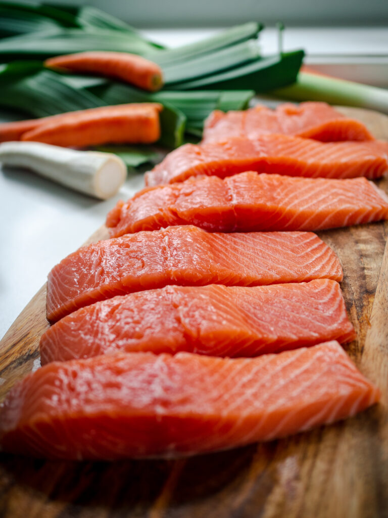 - 1 ¾ pounds (800 g) boneless and skinless Norwegian salmon, cut into large pieces