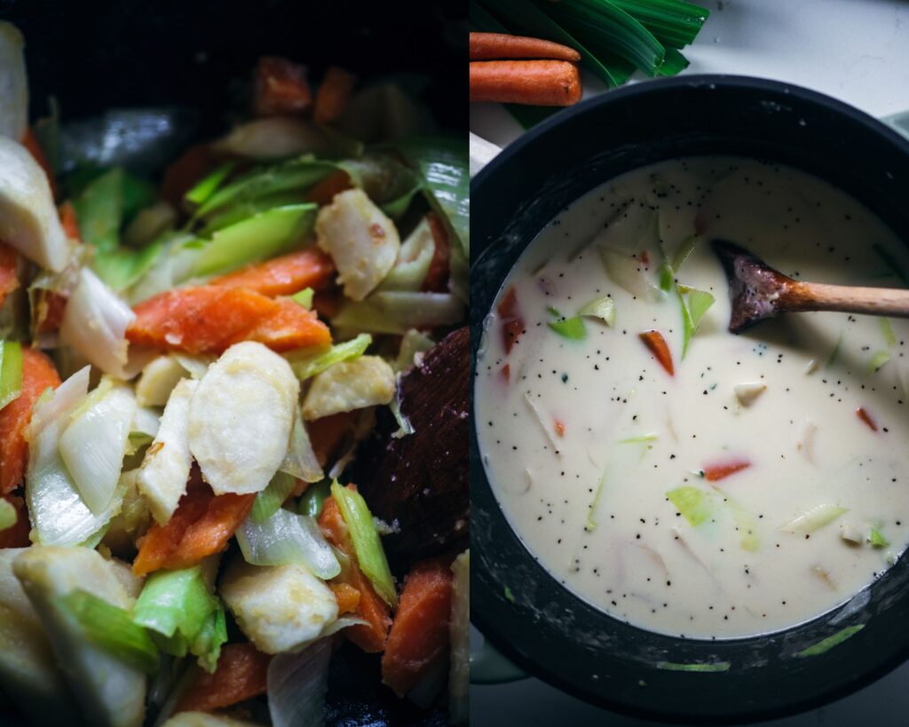 Fricassee is truly a triumph of the season, making use of what’s available while providing much comfort and a good reason to congregate around the table. Using salmon from Norway ensures a pure and fresh taste that is unsurpassed in flavor thanks to Norway’s ice cold and clean waters. After trying this, it just might be that fricassee will include a lot more salmon in it from now on.