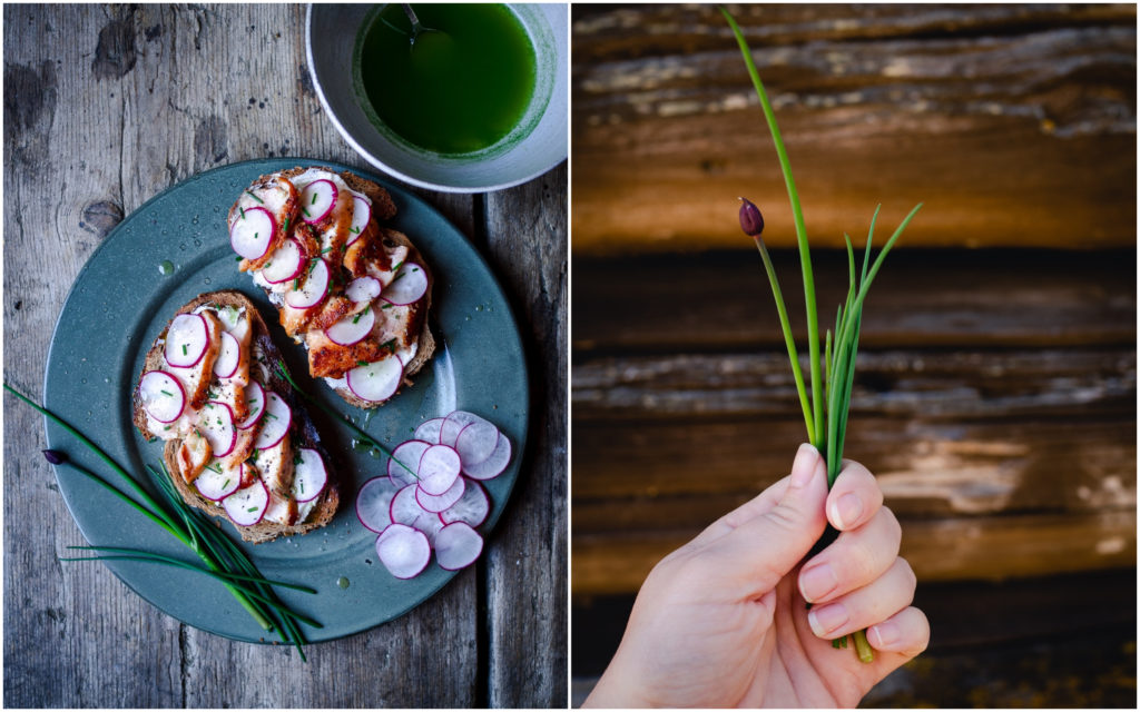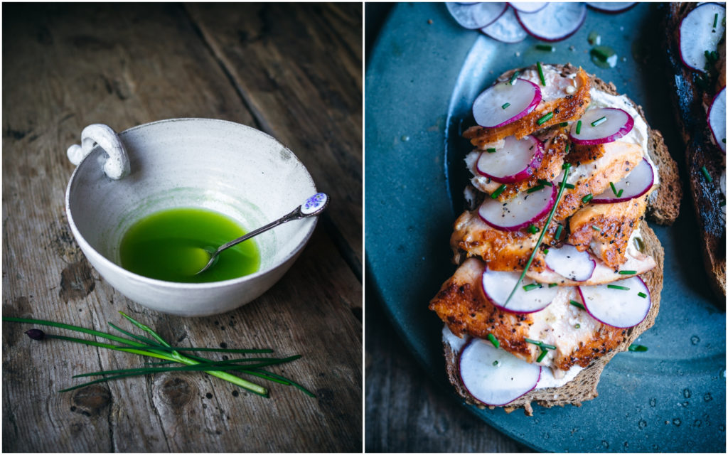 The quality of the fish is key to creating a truly mouthwatering meal. The salmon I use is from family-run Kvarøy Arctic, where it is farmed in the cold Arctic waters just off of Norway’s western coast (learn more about them here). The bright flavor and texture of their salmon is the real star here, and a quick sear on the pan with some salt and pepper is all it needs. Toasted bread gets a good spread of whipped goat’s cheese before a layer of juicy salmon pieces goes on top. Fresh radish slices and a drizzle of homemade chive oil round it all off, offering a nice balance to the seedy bread, tangy goat cheese, and rich salmon. Each bite is a welcome of spring connecting the garden and the sea.