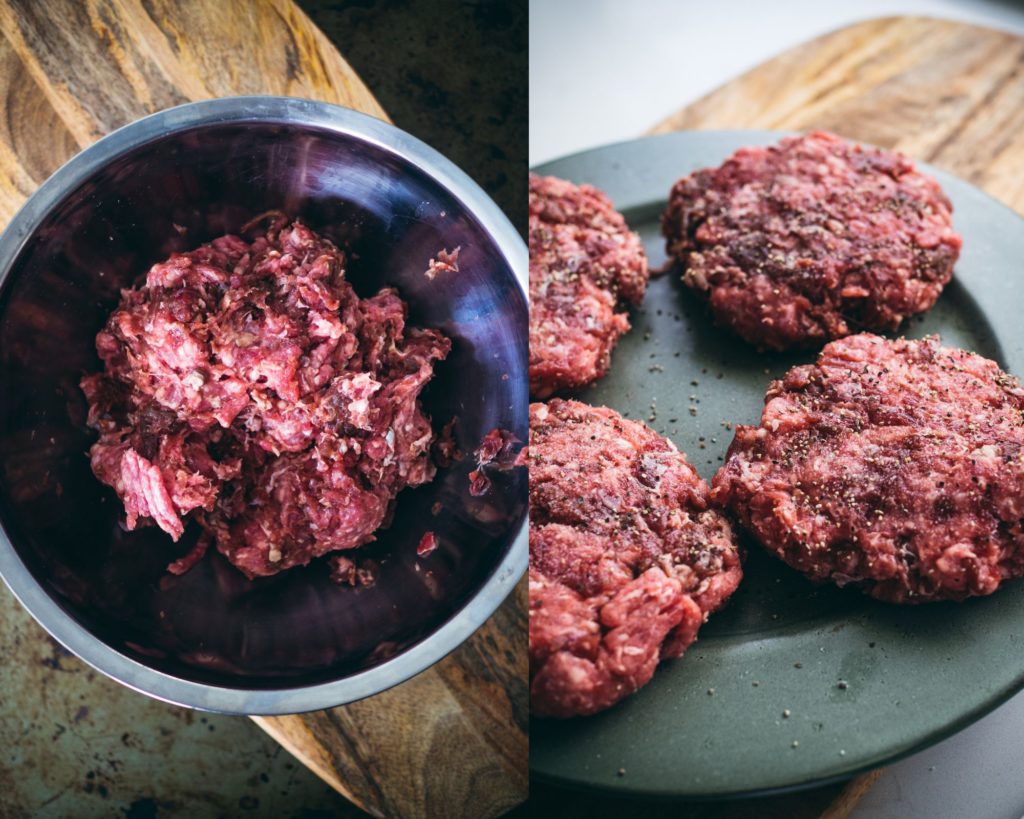 For the burgers, in a medium bowl, combine the shaved reindeer meat and ground beef. Form the meat into 4 equal-sized patties, pressing your thumb into the middle of each to make a little indention. Season the patties on both sides with salt and pepper.