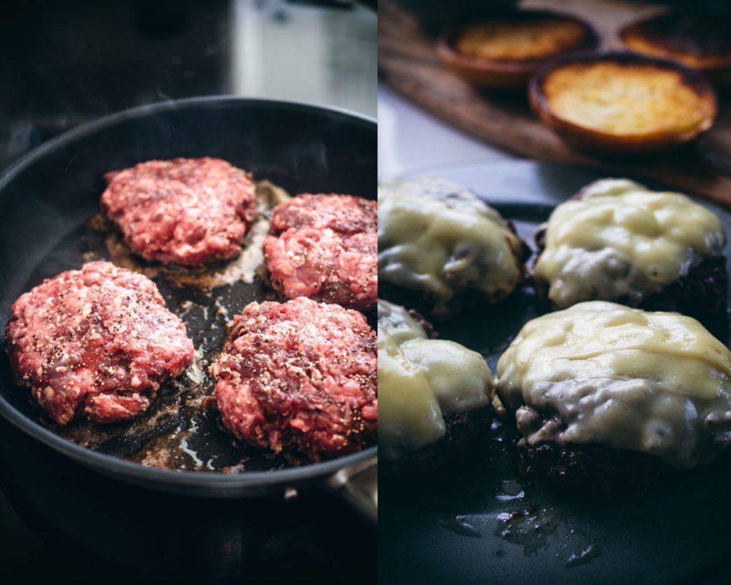 In a large frying pan, melt about 2 tablespoons butter over high heat. Add the patties and cook for about 3 minutes per side, flipping once until your ideal doneness. Place 2 to 3 slices of cheese on each patty during the last minute of cooking and cover with a lid until the cheese melts. While the patties are cooking, you can fry the bacon until crispy and toast the buns in a separate pan with some butter.