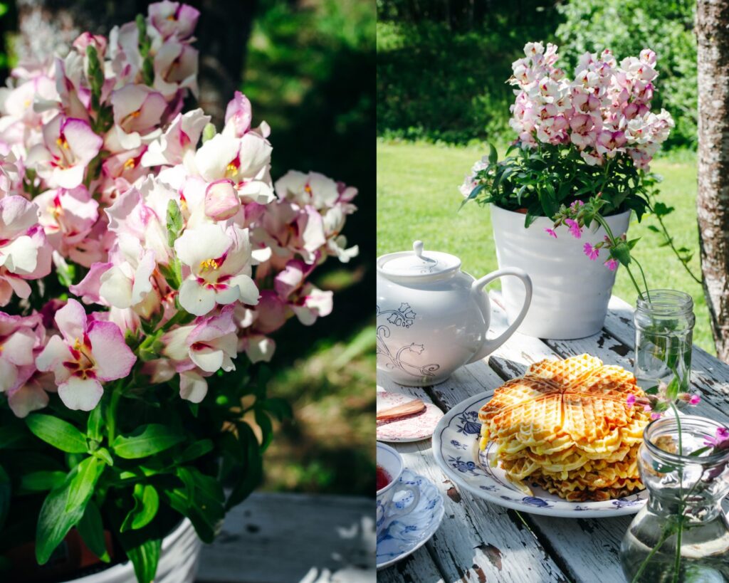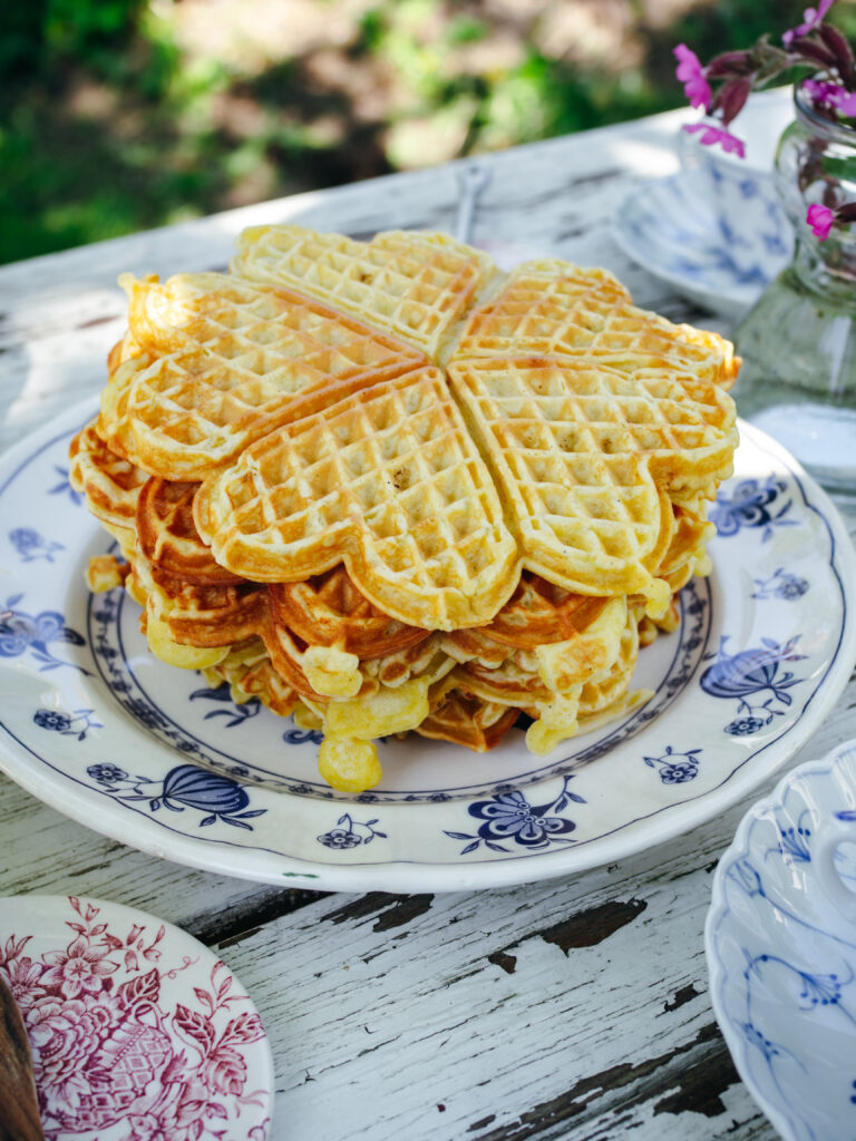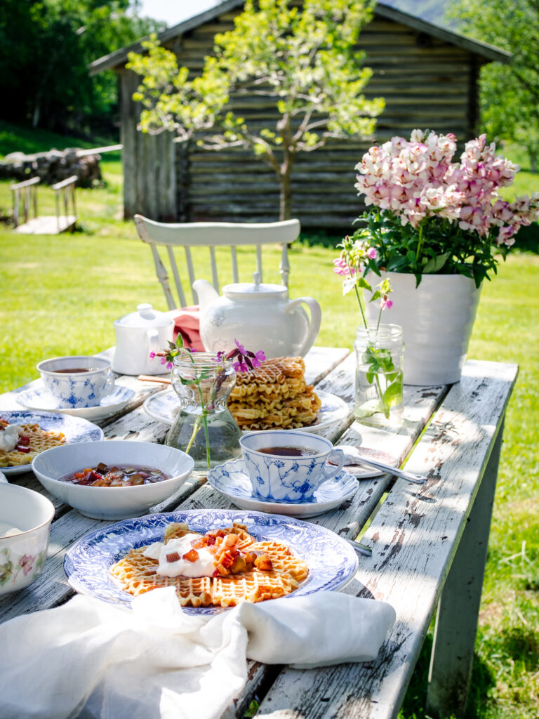 When the rhubarb stalks ripen and stand tall ready to be picked, it’s a sure sign that summer is just around the corner. And after playing catch up in the garden following a long winter season, sitting down by the tall trees to enjoy a simple brunch of waffles with poached rhubarb, while overlooking it all, is one of the best ways to embrace it.